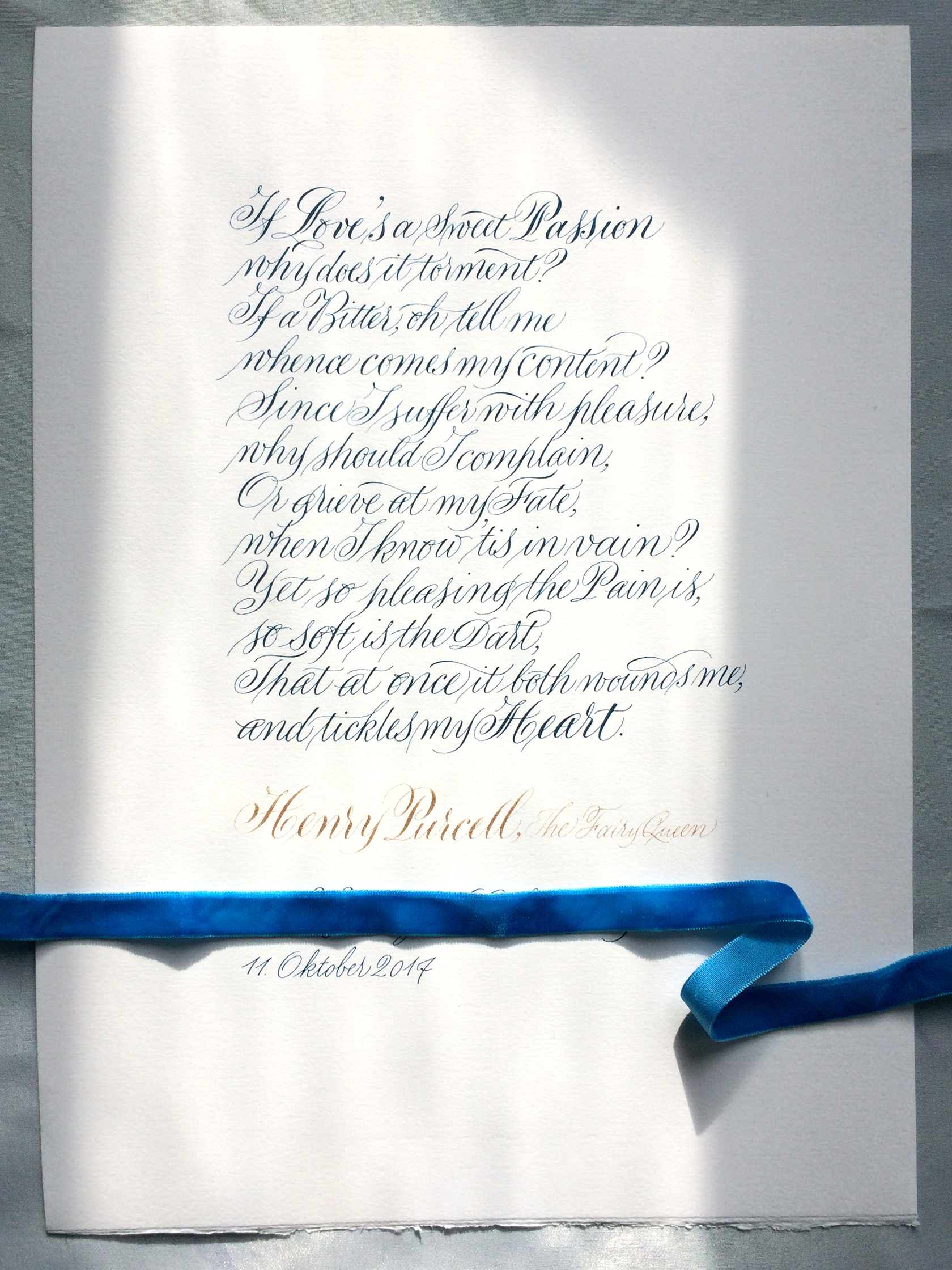 Liedtext von Henry Purcell kalligrafisch interpretiert mit Blau und Blassgold auf BĂĽttenpapier