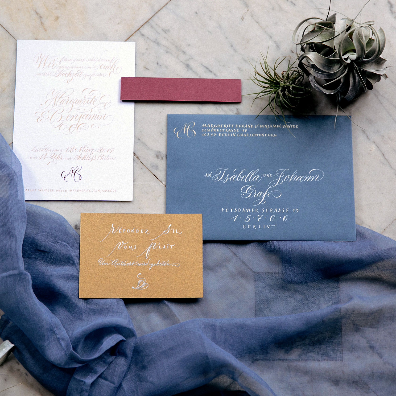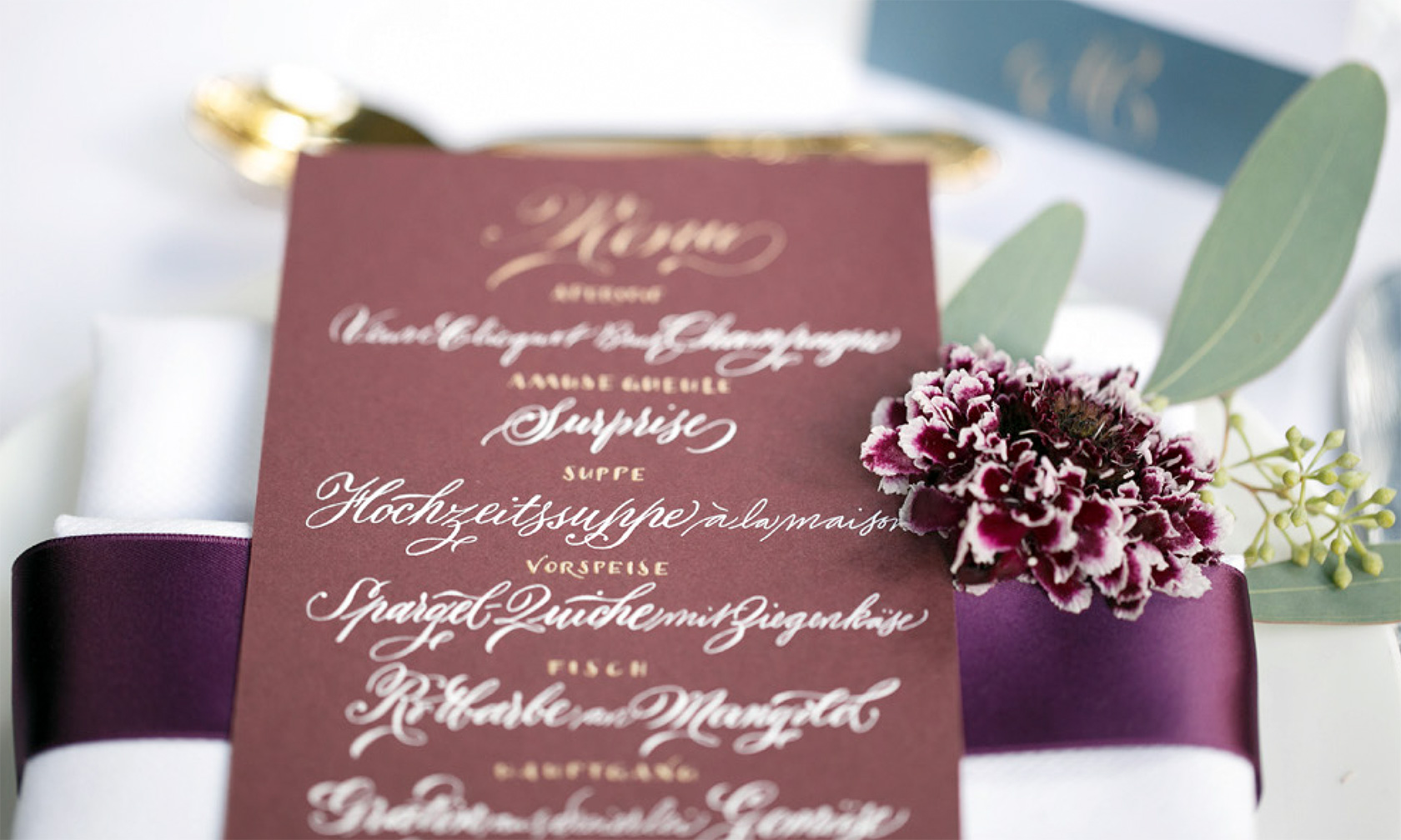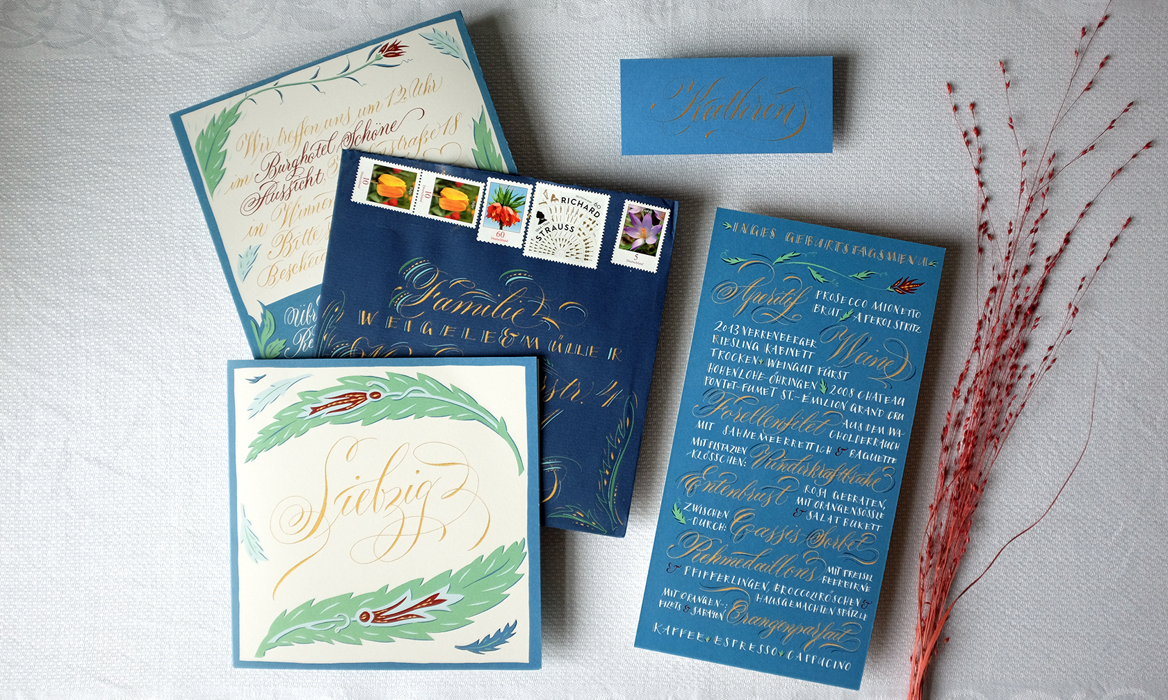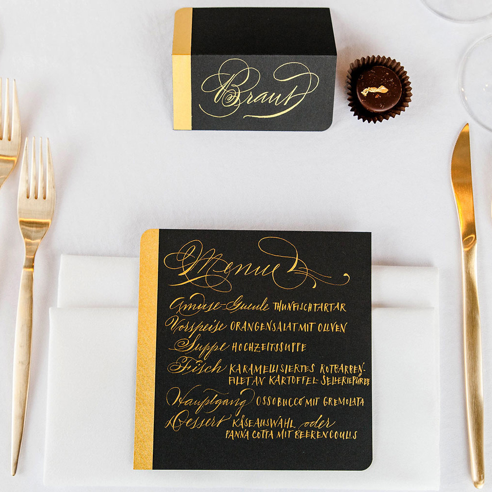 Ich gestalte Ihre Fest-Papeterie entweder als Gesamtpaket von der Beratung bis hin zur drucktechnischen Umsetzung, oder nur in einzelnen Bausteinen wie zum Beispiel mit auf Ihre Einladung und Ihr Hochzeitsthema abgestimmten Tischkarten oder Gastgeschenkanhängern – gern arbeite ich mit Ihrem Hochzeitsplaner zusammen. Auch die in Deutschland noch eher unübliche professionelle Beschriftung der Umschläge, die in Amerika zu jeder stilgerechten Hochzeit gehört, kann ich übernehmen.